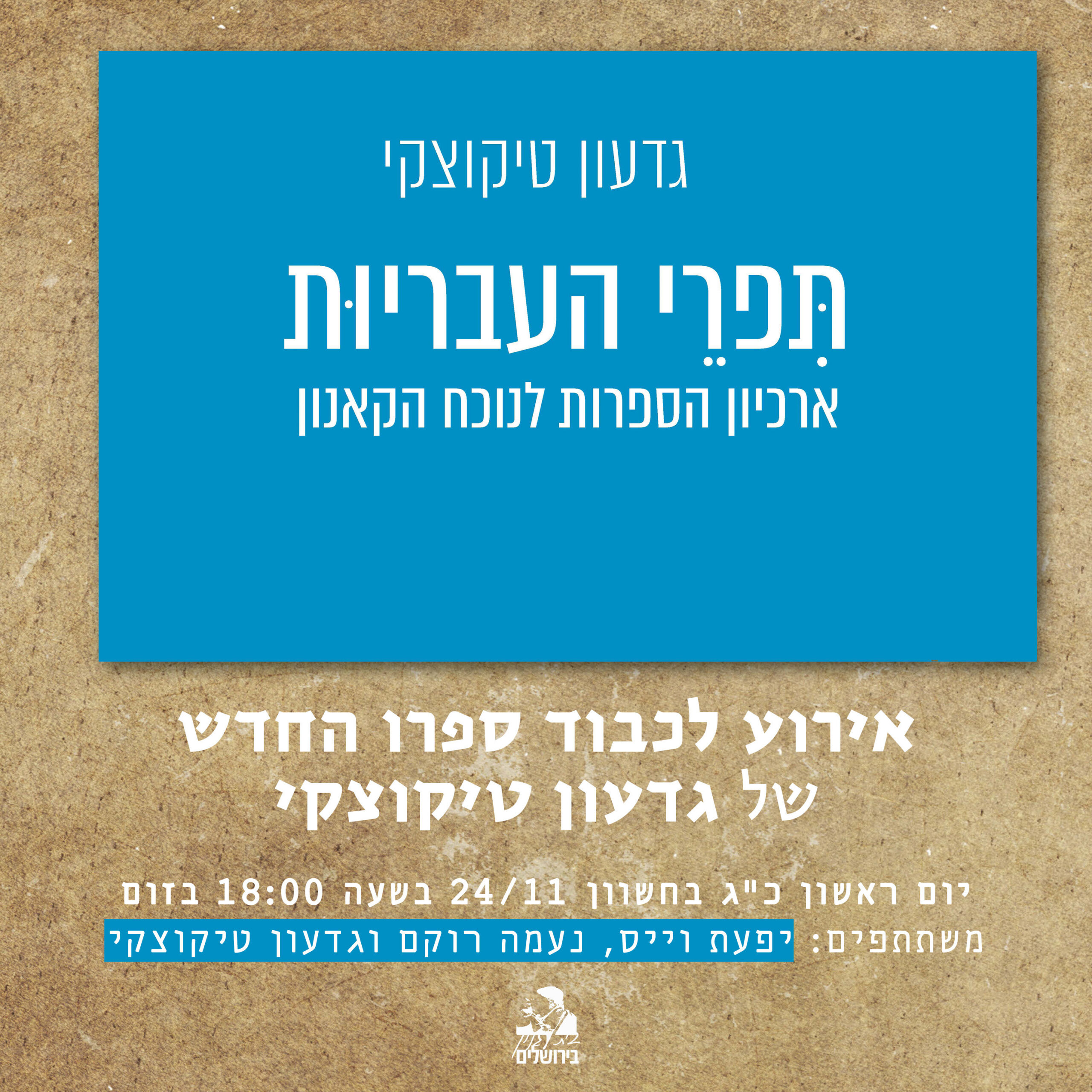האם ניתן לבנות לספרות בית? סיפור הקמתו של ארכיון הספרות העברית החדשה מגולל את הניסיון להעניק צביון ממסדי לספרות זו על רקע הקמת מדינת ישראל. בבסיס ניסיון זה עומד מתח מתמיד בין ״רפובליקת הרוח״ לבין מדינת הלאום. ספרו של פרופ׳ גדעון טיקוצקי ״תִּפרֵי העבריוּת״ מתחקה אחר ההיסטוריה של ארכיון גנזים הן בפני עצמה והן כראי להיווצרות הקאנון של הספרות העברית החדשה. ככל ראי, הארכיון מציג את המציאות כהוויתה. הקאנון נגלה כך באור חדש, על מחיקותיו, על שִכתוביו ועל הדחקותיו. ואולי יותר מכול נגלל כאן סיפור התלבטותן של תרבות וחברה ברגע משברי בין שלושה מישורי זמן משלימים ומנוגדים כאחד: הזמן היהודי, הזמן העברי והזמן הישראלי. באירוע מקוון מיוחד לכבוד צאת הספר ״תִּפרֵי העבריוּת״ נארח את יפעת וייס, נעמה רוקם וגדעון טיקוצקי לשיחה על הקאנון העברי ועל תפקידו התרבותי וההיסטורי של ארכיון גנזים.